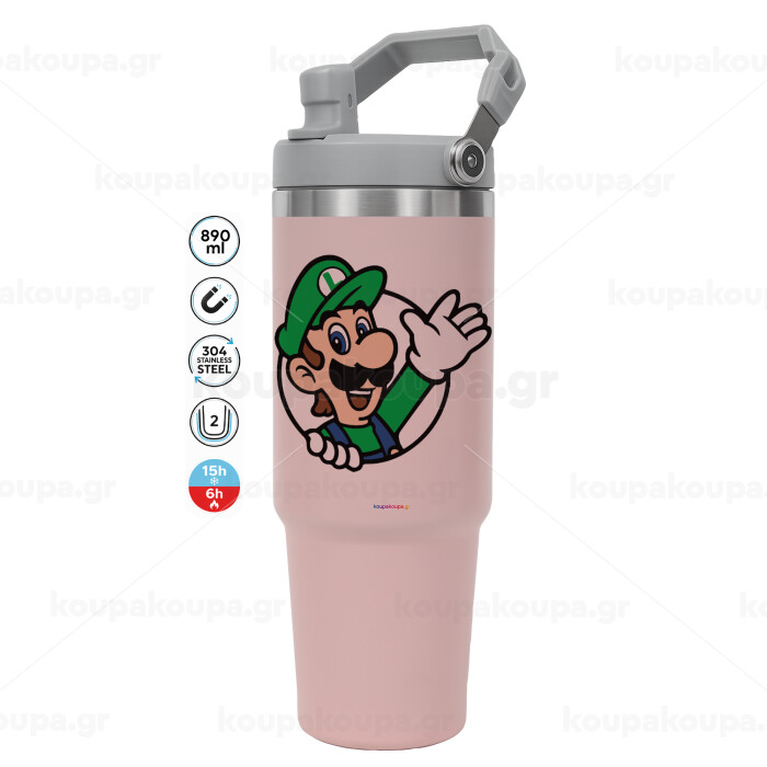 Super mario Luigi win, ΡΟΖ χρώματος Θερμός Ανοξείδωτο 890ml (30oz) με χερούλι