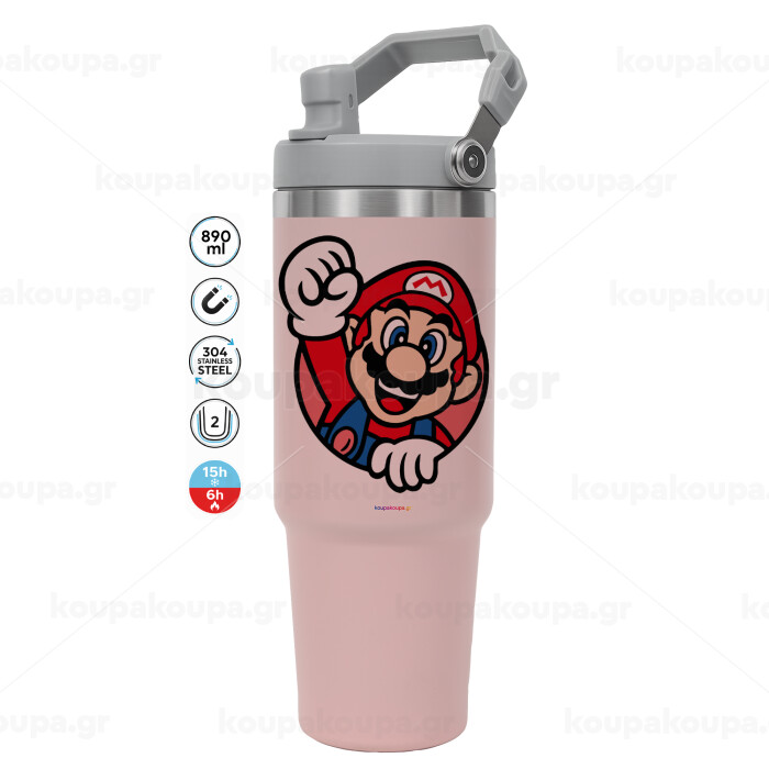 Super mario win, ΡΟΖ χρώματος Θερμός Ανοξείδωτο 890ml (30oz) με χερούλι
