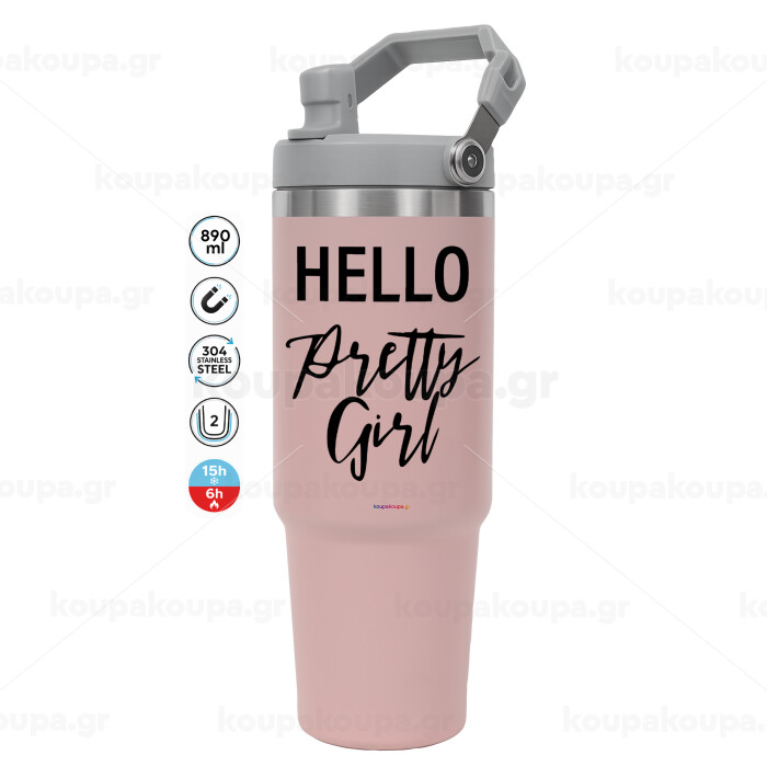 Hello pretty girl, ΡΟΖ χρώματος Θερμός Ανοξείδωτο 890ml (30oz) με χερούλι