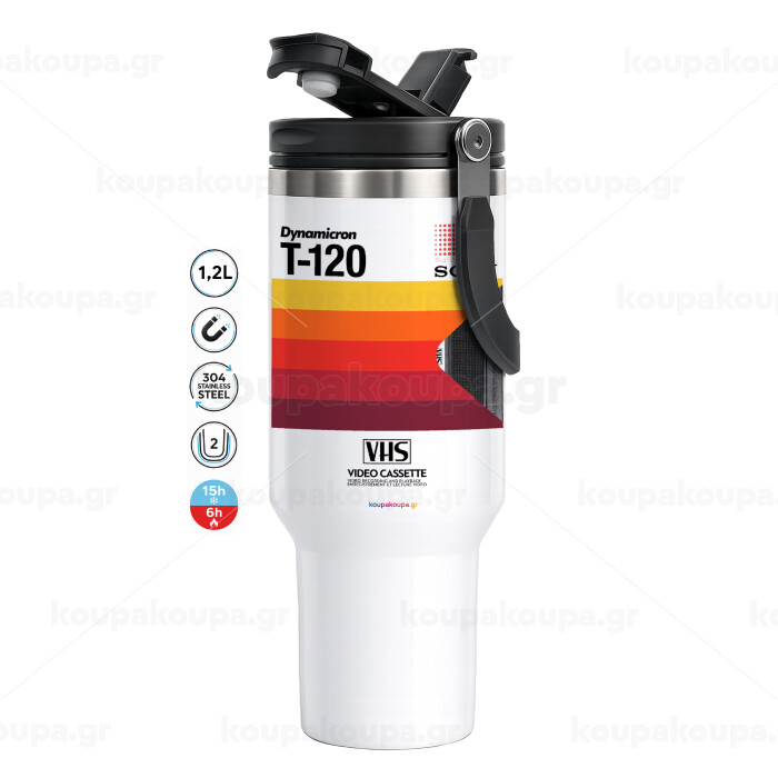 VHS sony dynamicron T-120, Mega Tumbler με καπάκι, διπλού τοιχώματος (θερμό) 1,2L