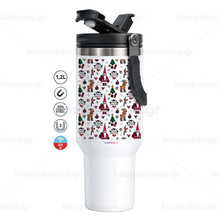 Santas, Deers & Trees, Mega Tumbler με καπάκι, διπλού τοιχώματος (θερμό) 1,2L