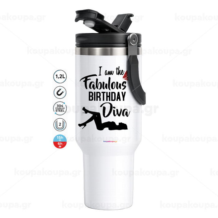 I am the fabulous Birthday Diva, Mega Tumbler με καπάκι, διπλού τοιχώματος (θερμό) 1,2L