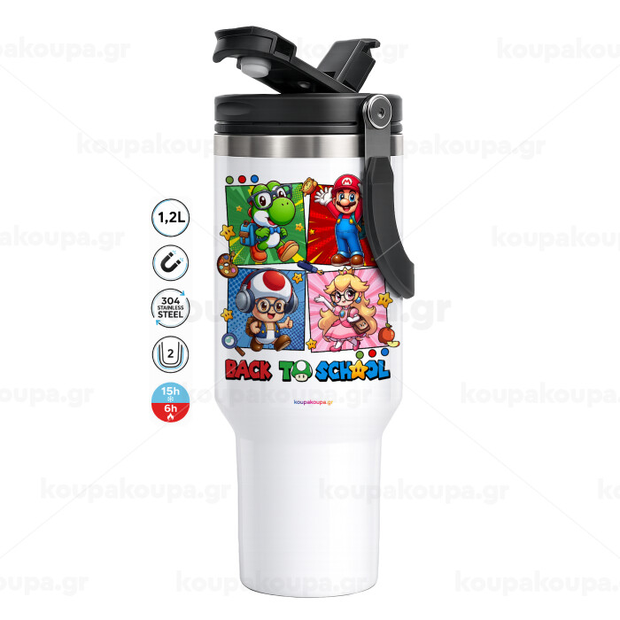 Back to the School Mario & Friends, Mega Tumbler με καπάκι, διπλού τοιχώματος (θερμό) 1,2L
