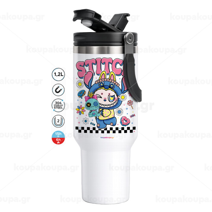 Labubu Stitch, Mega Tumbler με καπάκι, διπλού τοιχώματος (θερμό) 1,2L