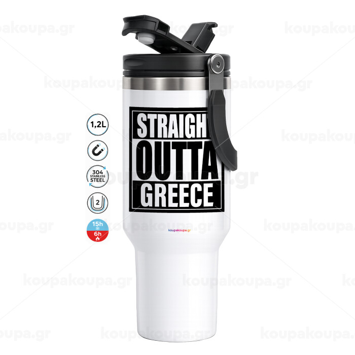 Straight Outta greece, Mega Tumbler με καπάκι, διπλού τοιχώματος (θερμό) 1,2L