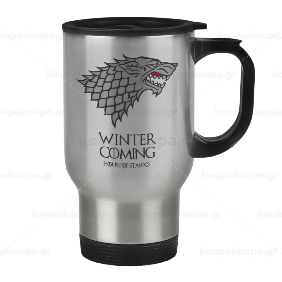 GOT House of Starks, winter coming, Κούπα ταξιδιού ανοξείδωτη με καπάκι, διπλού τοιχώματος (θερμό) 450ml