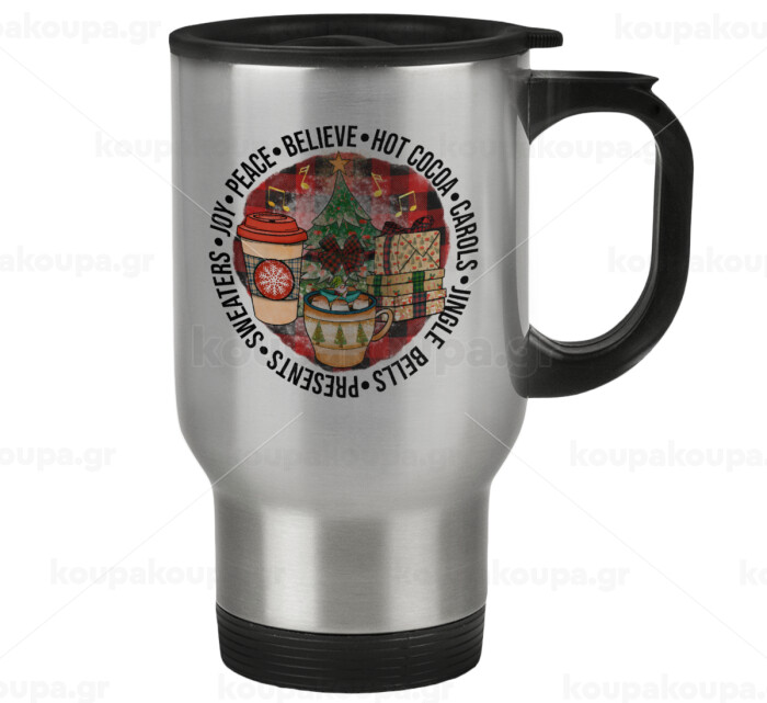 Joy, Peace, Believe, Hot Cocoa, Carols, Κούπα ταξιδιού ανοξείδωτη με καπάκι, διπλού τοιχώματος (θερμό) 450ml
