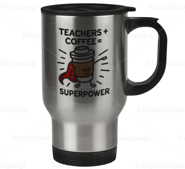 Teacher Coffee Super Power, Κούπα ταξιδιού ανοξείδωτη με καπάκι, διπλού τοιχώματος (θερμό) 450ml