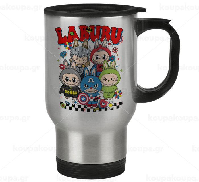 Labubu superheroes, Κούπα ταξιδιού ανοξείδωτη με καπάκι, διπλού τοιχώματος (θερμό) 450ml