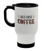 But first Coffee, Κούπα ταξιδιού ανοξείδωτη με καπάκι, διπλού τοιχώματος (θερμό) λευκή 450ml