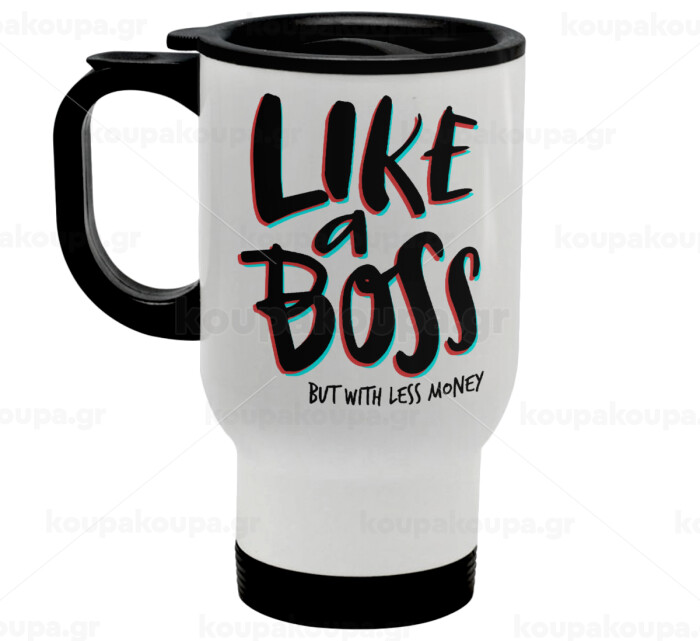 Like a boss, but with less money!!!, Κούπα ταξιδιού ανοξείδωτη με καπάκι, διπλού τοιχώματος (θερμό) λευκή 450ml