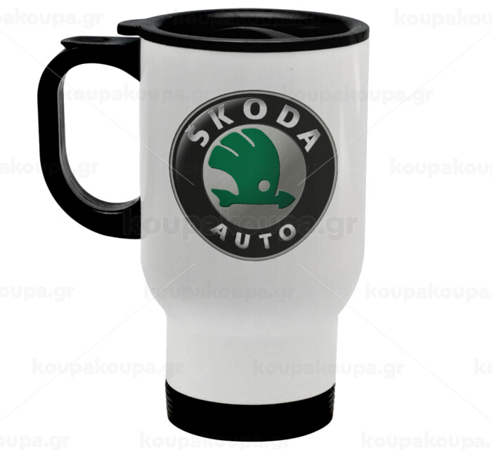 SKODA, Κούπα ταξιδιού ανοξείδωτη με καπάκι, διπλού τοιχώματος (θερμό) λευκή 450ml