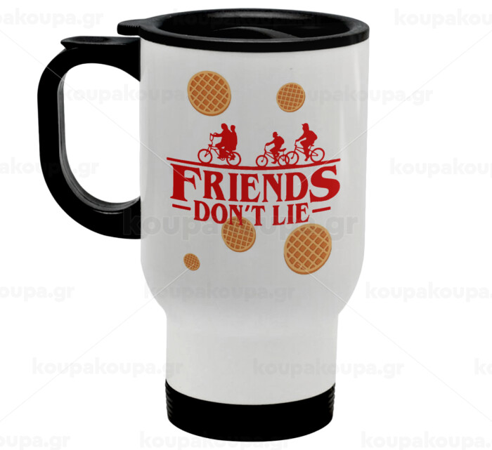 Friends Don't Lie, Stranger Things, Κούπα ταξιδιού ανοξείδωτη με καπάκι, διπλού τοιχώματος (θερμό) λευκή 450ml