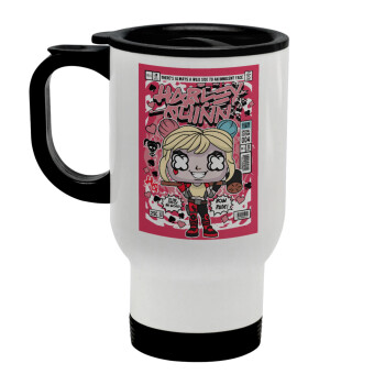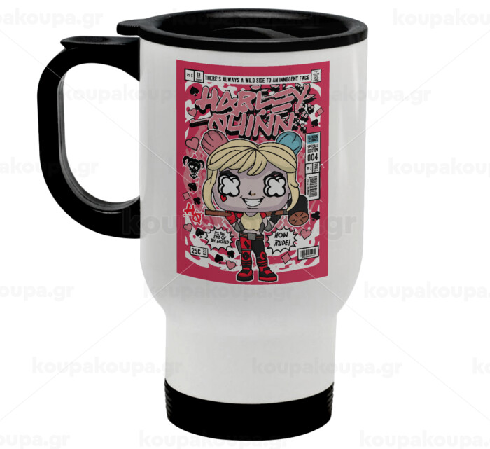 Harley Quinn (Χάρλεϊ Κουίν), Κούπα ταξιδιού ανοξείδωτη με καπάκι, διπλού τοιχώματος (θερμό) λευκή 450ml
