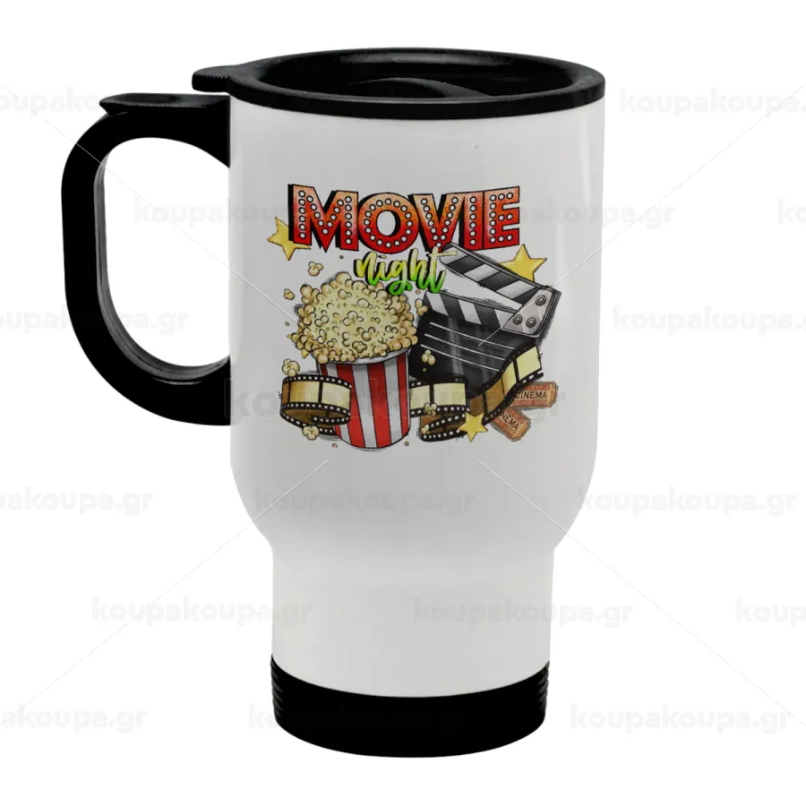 Movie night, Κούπα ταξιδιού ανοξείδωτη με καπάκι, διπλού τοιχώματος (θερμό) λευκή 450ml