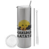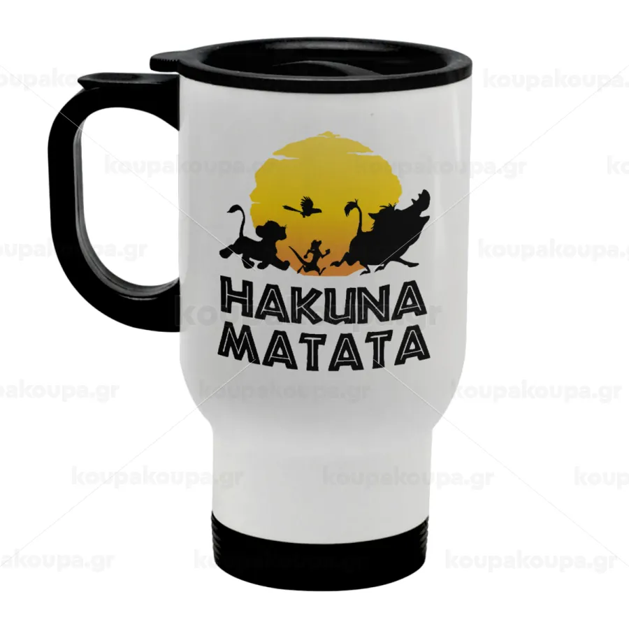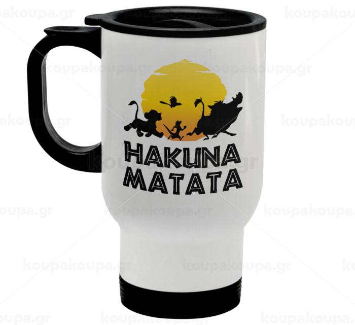 Hakuna Matata, Κούπα ταξιδιού ανοξείδωτη με καπάκι, διπλού τοιχώματος (θερμό) λευκή 450ml