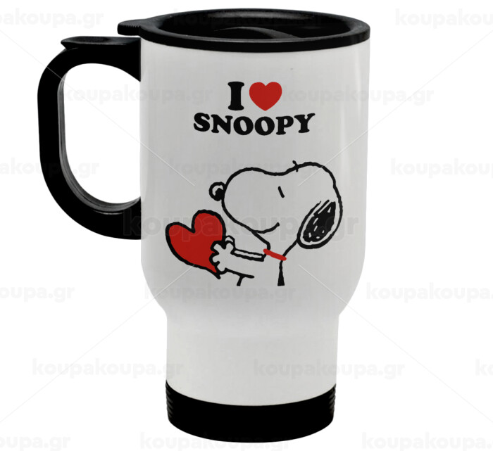 I LOVE SNOOPY, Κούπα ταξιδιού ανοξείδωτη με καπάκι, διπλού τοιχώματος (θερμό) λευκή 450ml