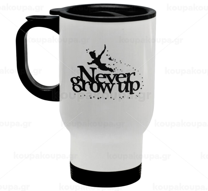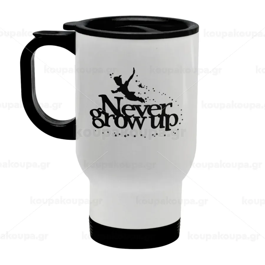 Peter pan, Never Grow UP, Κούπα ταξιδιού ανοξείδωτη με καπάκι, διπλού τοιχώματος (θερμό) λευκή 450ml