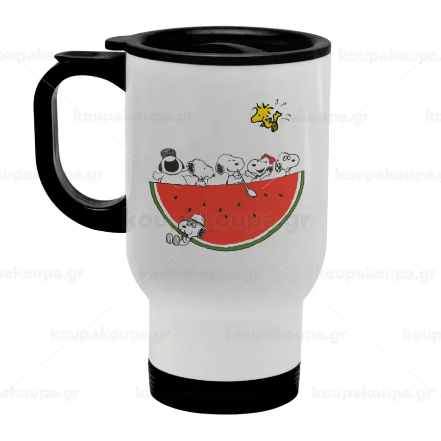 Snoopy summer, Κούπα ταξιδιού ανοξείδωτη με καπάκι, διπλού τοιχώματος (θερμό) λευκή 450ml