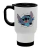 Stitch hello!!!, Κούπα ταξιδιού ανοξείδωτη με καπάκι, διπλού τοιχώματος (θερμό) λευκή 450ml