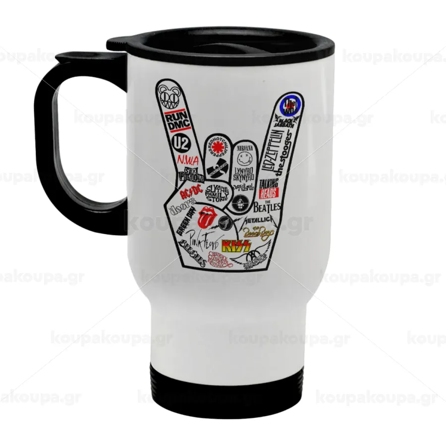 Best Rock Bands hand, Κούπα ταξιδιού ανοξείδωτη με καπάκι, διπλού τοιχώματος (θερμό) λευκή 450ml
