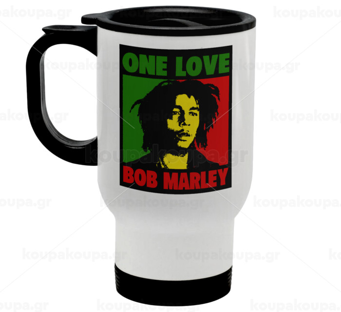 Bob marley, one love, Κούπα ταξιδιού ανοξείδωτη με καπάκι, διπλού τοιχώματος (θερμό) λευκή 450ml