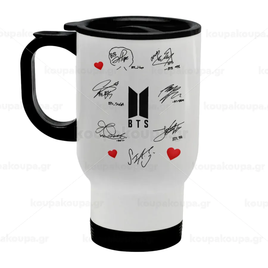 BTS signatures, Κούπα ταξιδιού ανοξείδωτη με καπάκι, διπλού τοιχώματος (θερμό) λευκή 450ml