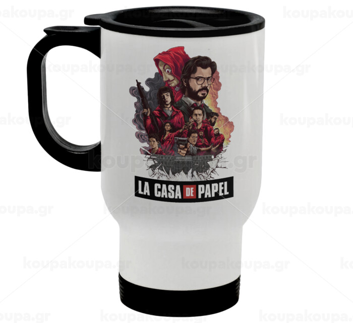 La casa de papel drawing cover, Κούπα ταξιδιού ανοξείδωτη με καπάκι, διπλού τοιχώματος (θερμό) λευκή 450ml