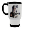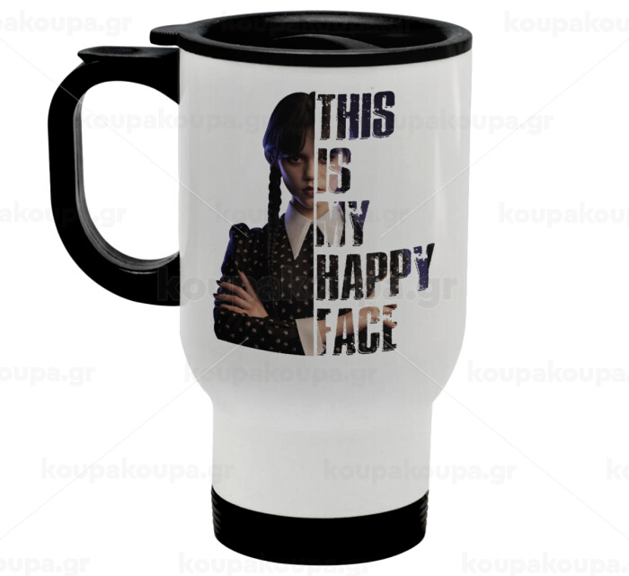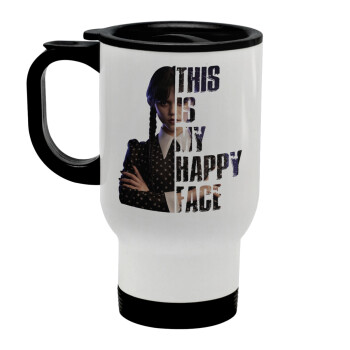 Wednesday, This is my happy face, Κούπα ταξιδιού ανοξείδωτη με καπάκι, διπλού τοιχώματος (θερμό) λευκή 450ml