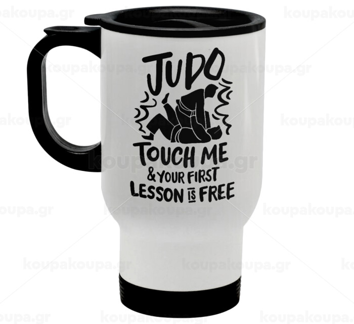 Judo Touch Me And Your First Lesson Is Free, Κούπα ταξιδιού ανοξείδωτη με καπάκι, διπλού τοιχώματος (θερμό) λευκή 450ml