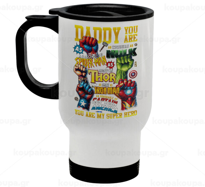 Daddy You Are my Hero, Κούπα ταξιδιού ανοξείδωτη με καπάκι, διπλού τοιχώματος (θερμό) λευκή 450ml