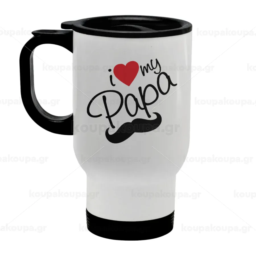 I Love my papa, Κούπα ταξιδιού ανοξείδωτη με καπάκι, διπλού τοιχώματος (θερμό) λευκή 450ml