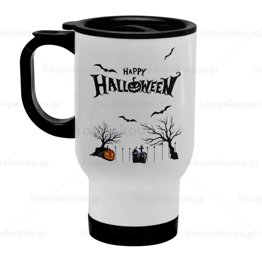 Happy Halloween cemetery, Κούπα ταξιδιού ανοξείδωτη με καπάκι, διπλού τοιχώματος (θερμό) λευκή 450ml