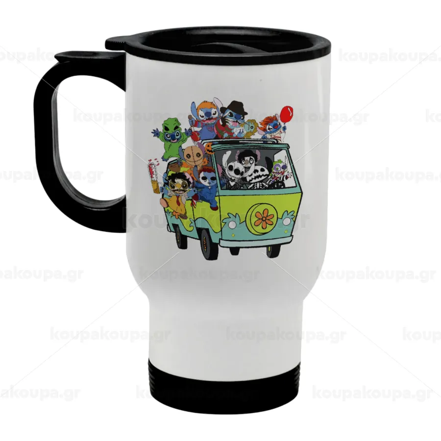 Stitch Halloween scooby car, Κούπα ταξιδιού ανοξείδωτη με καπάκι, διπλού τοιχώματος (θερμό) λευκή 450ml