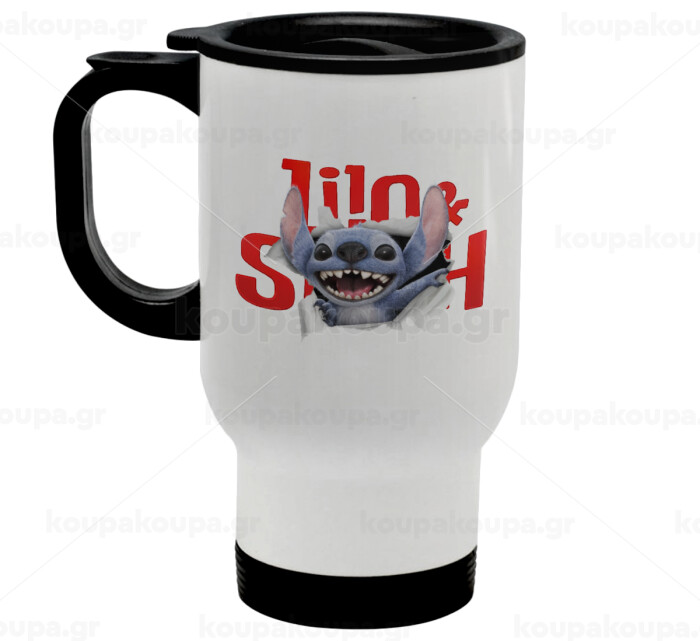 Stitch movie, Κούπα ταξιδιού ανοξείδωτη με καπάκι, διπλού τοιχώματος (θερμό) λευκή 450ml