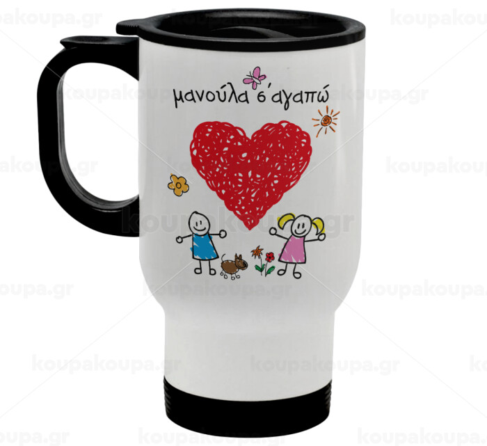 Μανούλα σ'αγαπώ!, Κούπα ταξιδιού ανοξείδωτη με καπάκι, διπλού τοιχώματος (θερμό) λευκή 450ml