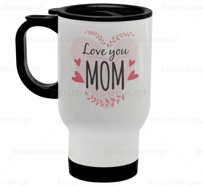 Mother's day I Love you Mom heart, Κούπα ταξιδιού ανοξείδωτη με καπάκι, διπλού τοιχώματος (θερμό) λευκή 450ml