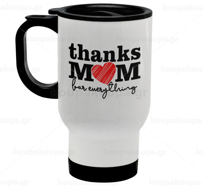 Thanks mom for everything, Κούπα ταξιδιού ανοξείδωτη με καπάκι, διπλού τοιχώματος (θερμό) λευκή 450ml