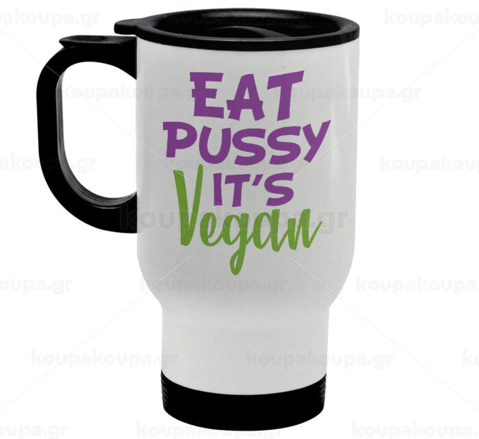 EAT pussy it's vegan, Κούπα ταξιδιού ανοξείδωτη με καπάκι, διπλού τοιχώματος (θερμό) λευκή 450ml