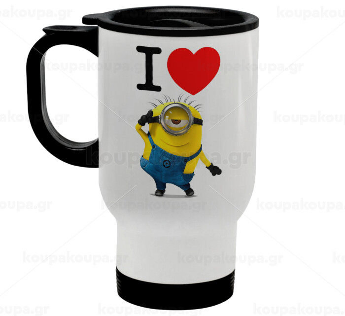 I love by minion, Κούπα ταξιδιού ανοξείδωτη με καπάκι, διπλού τοιχώματος (θερμό) λευκή 450ml