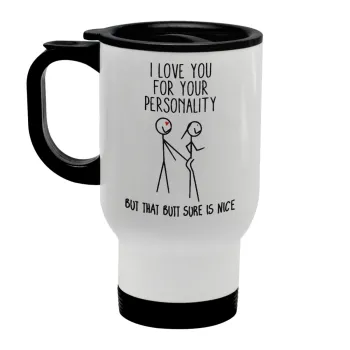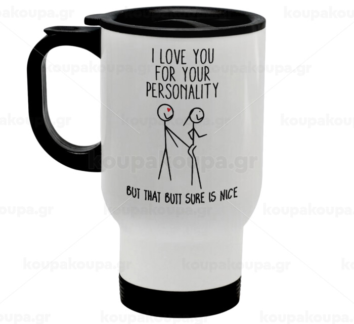 I Love you for your personality, Κούπα ταξιδιού ανοξείδωτη με καπάκι, διπλού τοιχώματος (θερμό) λευκή 450ml