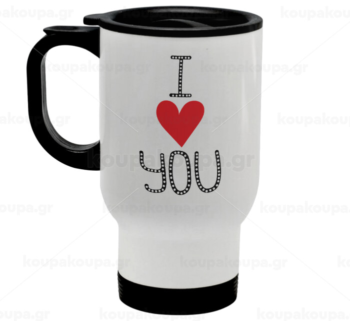 I Love You small dots, Κούπα ταξιδιού ανοξείδωτη με καπάκι, διπλού τοιχώματος (θερμό) λευκή 450ml