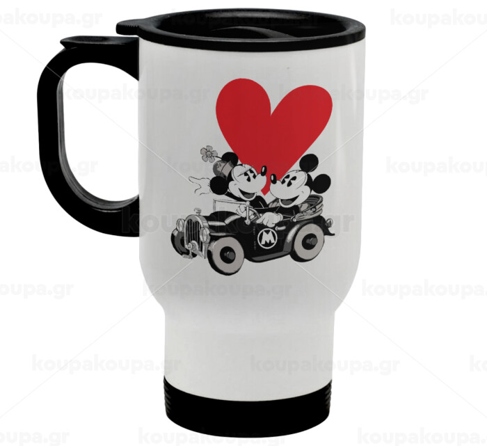 Mickey & Minnie love car, Κούπα ταξιδιού ανοξείδωτη με καπάκι, διπλού τοιχώματος (θερμό) λευκή 450ml