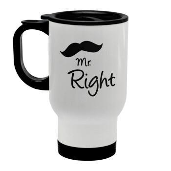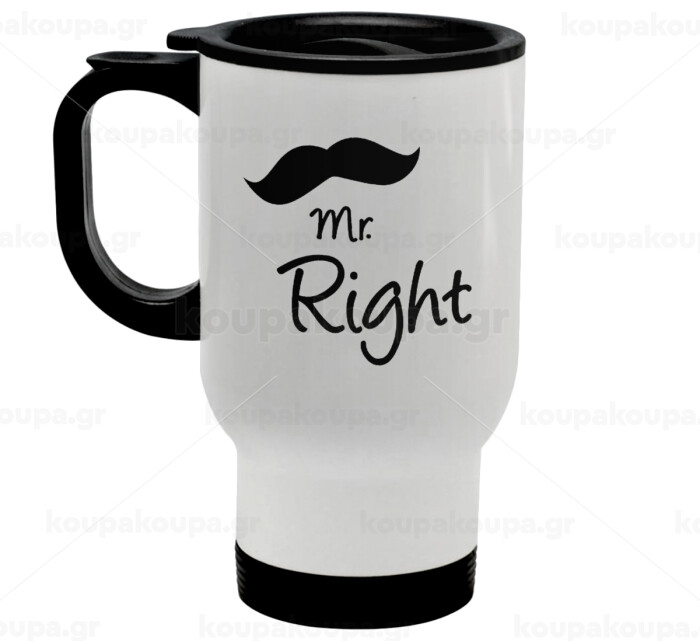 Mr right Mustache, Κούπα ταξιδιού ανοξείδωτη με καπάκι, διπλού τοιχώματος (θερμό) λευκή 450ml