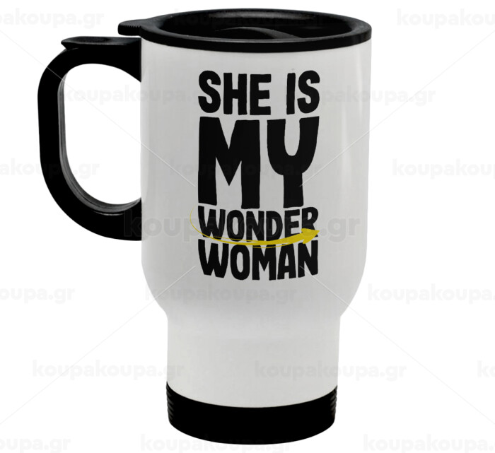 She is my wonder woman, Κούπα ταξιδιού ανοξείδωτη με καπάκι, διπλού τοιχώματος (θερμό) λευκή 450ml