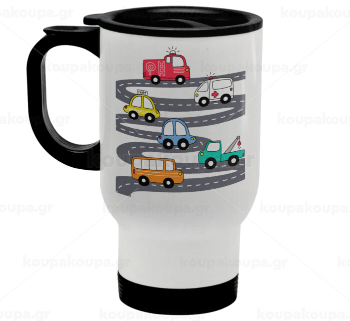 Hand drawn childish set with cars, Κούπα ταξιδιού ανοξείδωτη με καπάκι, διπλού τοιχώματος (θερμό) λευκή 450ml