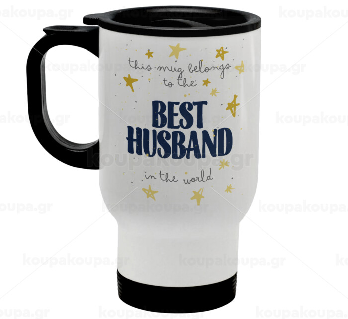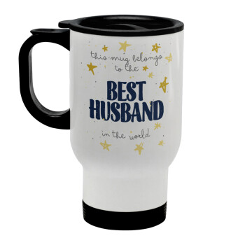 This mug belongs to the BEST HUSBAND in the world!, Κούπα ταξιδιού ανοξείδωτη με καπάκι, διπλού τοιχώματος (θερμό) λευκή 450ml