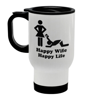 Happy Wife, Happy Life, Κούπα ταξιδιού ανοξείδωτη με καπάκι, διπλού τοιχώματος (θερμό) λευκή 450ml