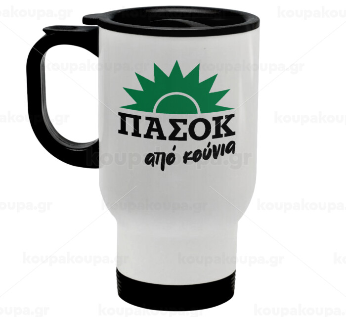 ΠΑΣΟΚ από κούνια, Κούπα ταξιδιού ανοξείδωτη με καπάκι, διπλού τοιχώματος (θερμό) λευκή 450ml