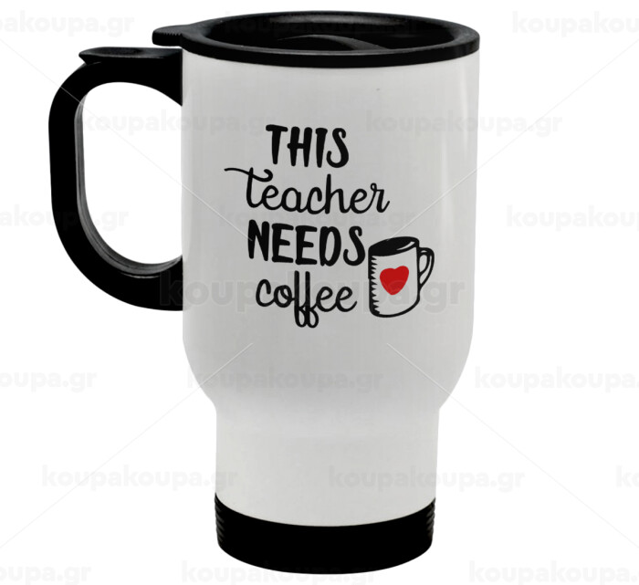 Τhis teacher needs coffee, Κούπα ταξιδιού ανοξείδωτη με καπάκι, διπλού τοιχώματος (θερμό) λευκή 450ml